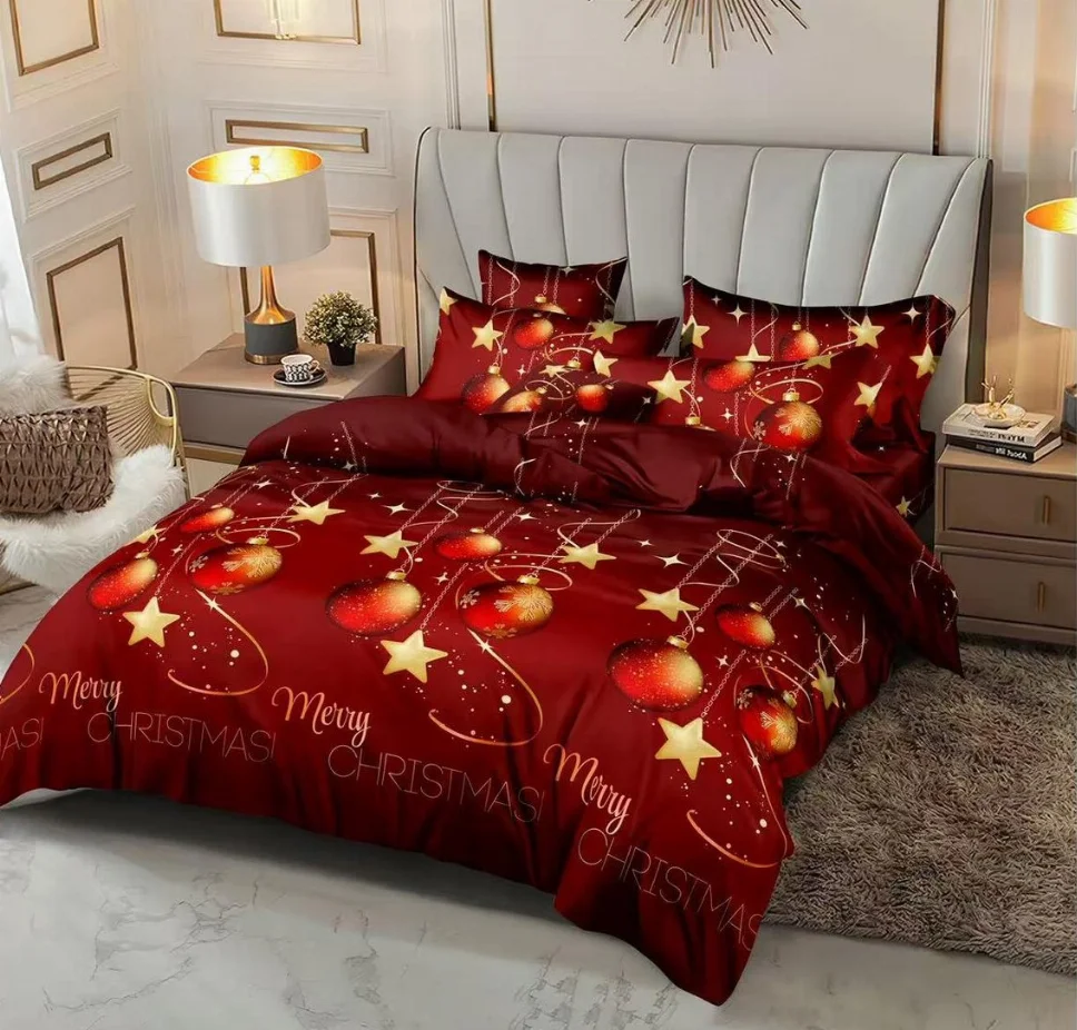 Lenjerie de pat din finet 6 piese, roșu cu globuri și steluțe aurii-EX17 Descoperiți modele festive cu reni, braduri de Crăciun, zăpadă și multe altele. Aceste designuri aduc un plus de magie la decorul dormitorului dvs.