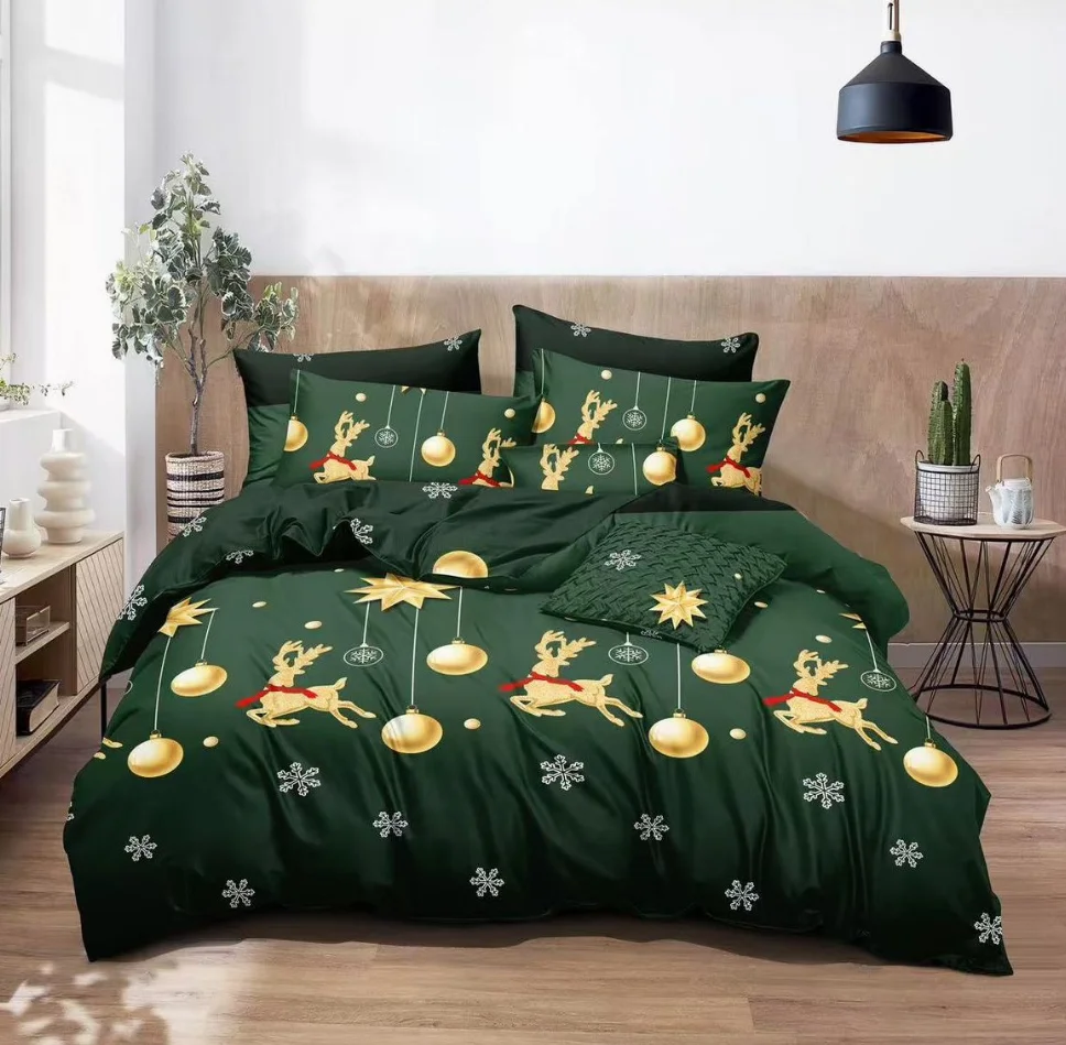 1. Lenjerie de pat din finet 6 piese, verde cu reni aurii și globuri-EX8 Descoperiți modele festive cu reni, braduri de Crăciun, zăpadă și multe altele. Aceste designuri aduc un plus de magie la decorul dormitorului dvs.