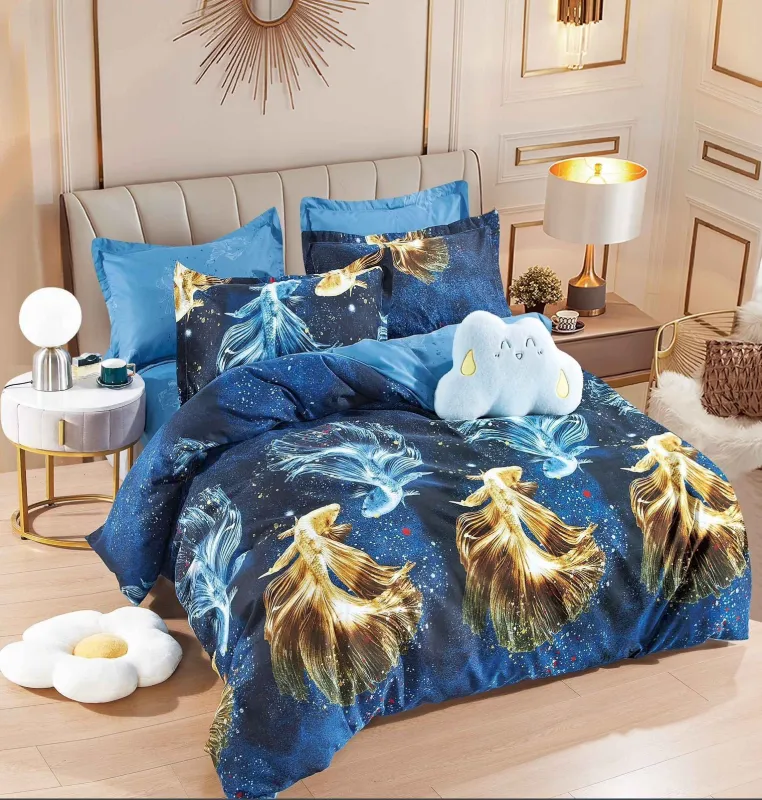 Transformă-ți dormitorul într-o oază de relaxare cu o Lenjerie de pat,6 Piese, finet,Albastru,Peste auriu-FJ199. Realizată dintr-un material finet de calitate superioară, această lenjerie îți va învălui simțurile într-o textură moale și plăcută la atingere, asigurându-ți un somn odihnitor noapte de noapte. Materialul este special tratat pentru a-și păstra culorile vii și pentru a rezista la utilizări repetate, menținând aspectul proaspăt și îngrijit al patului tău.