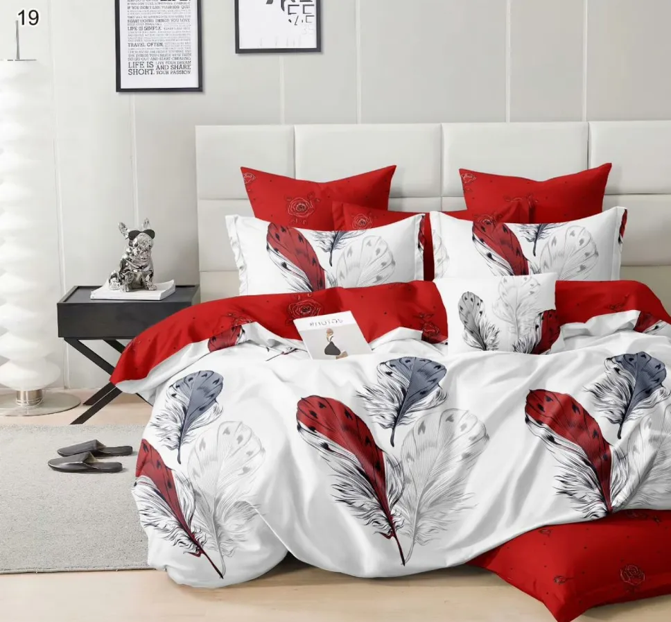 Lenjerie de pat Finet 6 piese, alb cu pene roșii și gri-LP19 - Descoperă confortul și rafinamentul oferite de acest set de lenjerie de pat din finet, format din 6 piese. Colecția este realizată dintr-un material textil tratat special, conferind țesăturii o senzație moale la atingere și o durabilitate remarcabilă în timp.