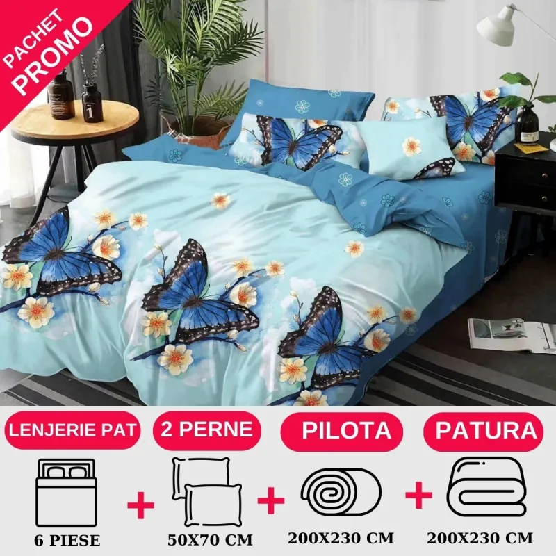 Lenjerie pentru pat dublu cu 6 piese, confectionata din 100% bumbac, tesatura tip finet.
