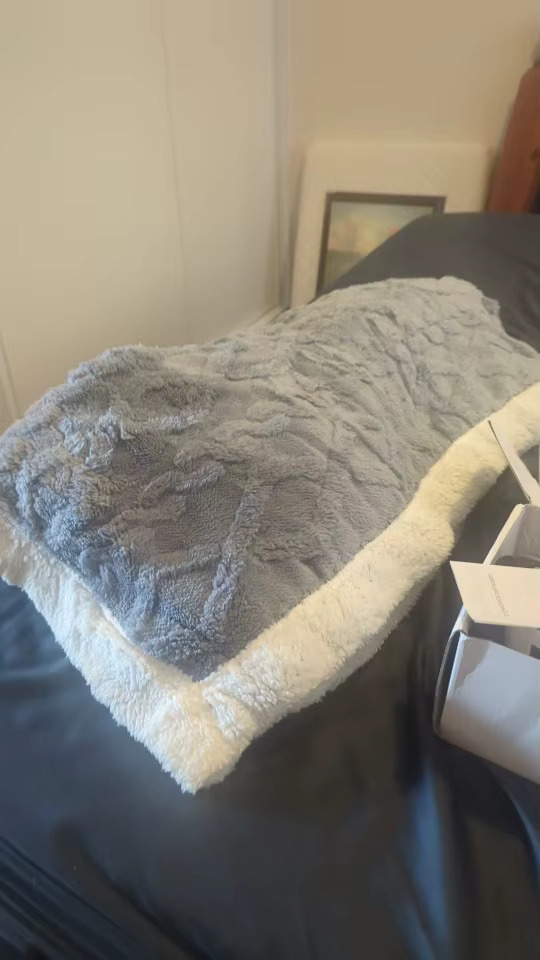 Auuu, ce bine e! Pătura asta gri cu model împletit e mega plușoasă, exact cum mi-am dorit. Transformă camera instant, se simte super fină la atingere. O ador!