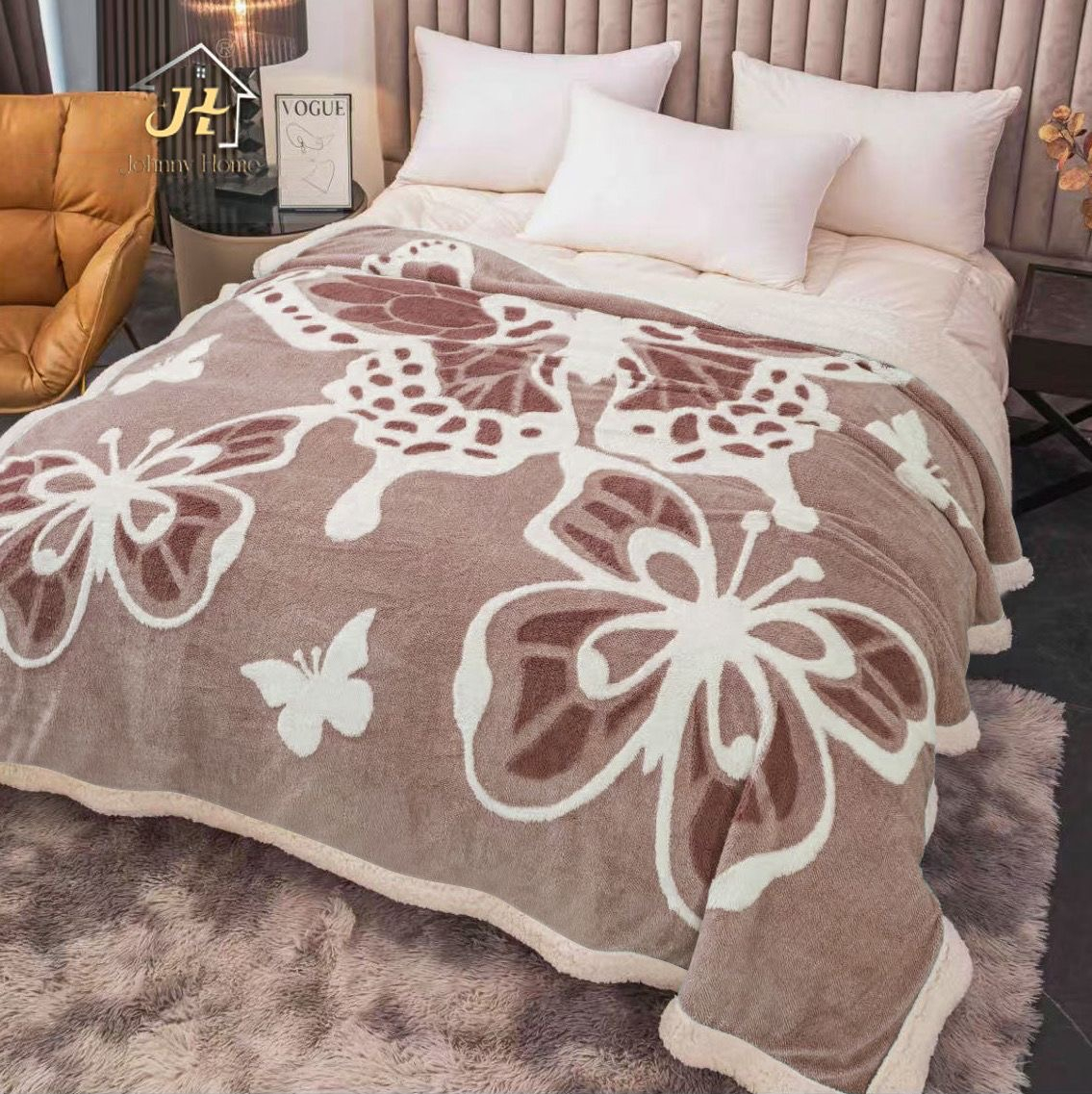Patura Cocolino cu Blanita, 3D, maro cu fluturi albi și bej-LK8 Pătura Cocolino cu blăniță 200x230cm  oferă căldură intensă  și moliciune plăcută  pentru un somn odihnitor și relaxare acasă. Materialul său catifelat și designul elegant  adaugă un plus de confort și stil dormitorului tău.