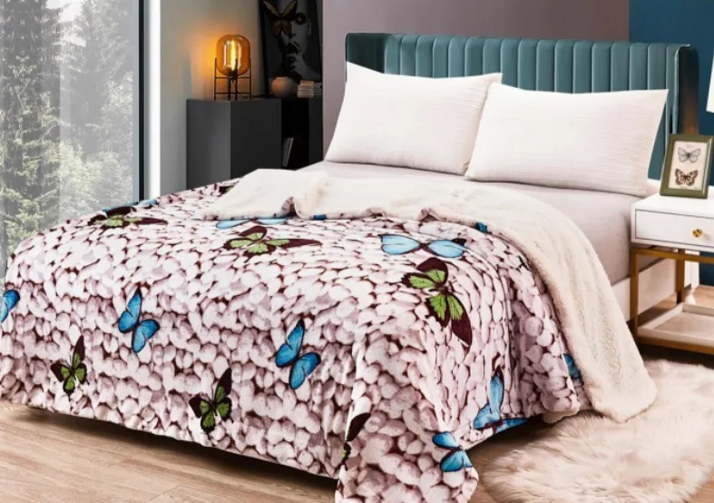 Patura Groasa Cocolino cu Blanita, alb cu fluturi albastri si verzi-NR25 are textura pufoasa si catifelata,o poti folosi atat pentru decor cat si pentru a te incalzi in zilele friguroase. Ideale pentru a inlocui atat pilotele grele care incalzesc greu, dar si cearsafurile subtiri si rigide. Paturile cocolino sunt extrem de pufoase si calduroase nu sunt grele.
