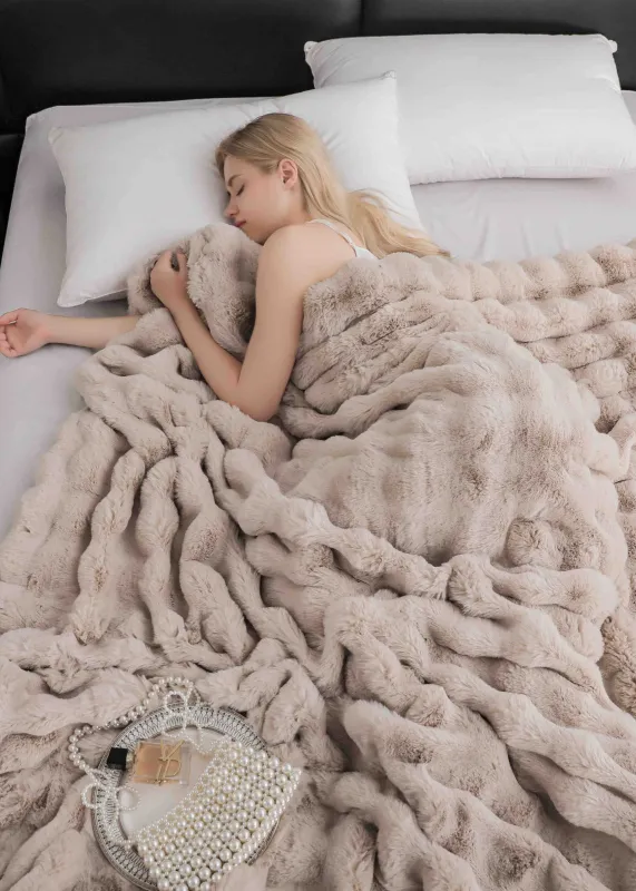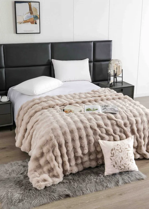 Patura moale tip cocolino din material pufos si catifelat cu blana artificiala de iepure , ce poate fi utilizata atat pentru decor, cat si pentru a te inveli in zilele friguroase.