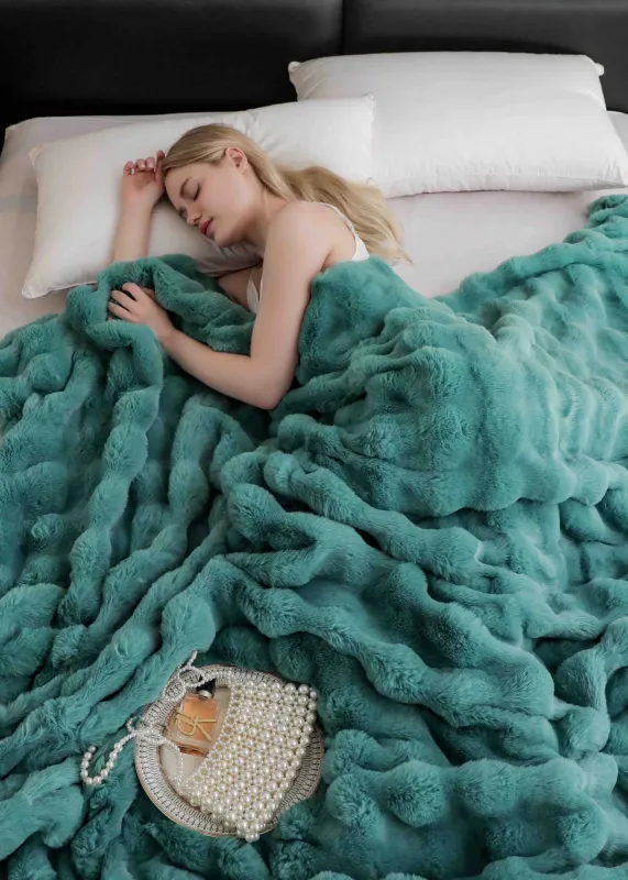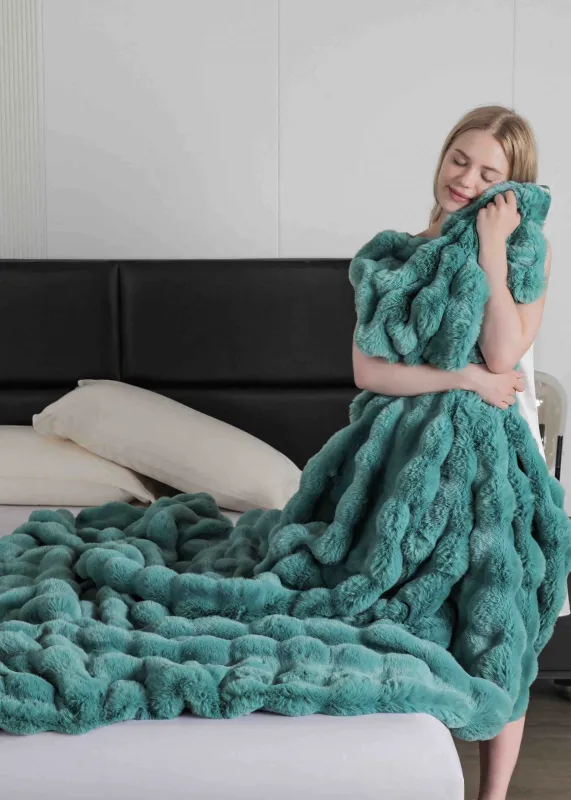 Patura moale tip cocolino din material pufos si catifelat cu blana artificiala de iepure , ce poate fi utilizata atat pentru decor, cat si pentru a te inveli in zilele friguroase.