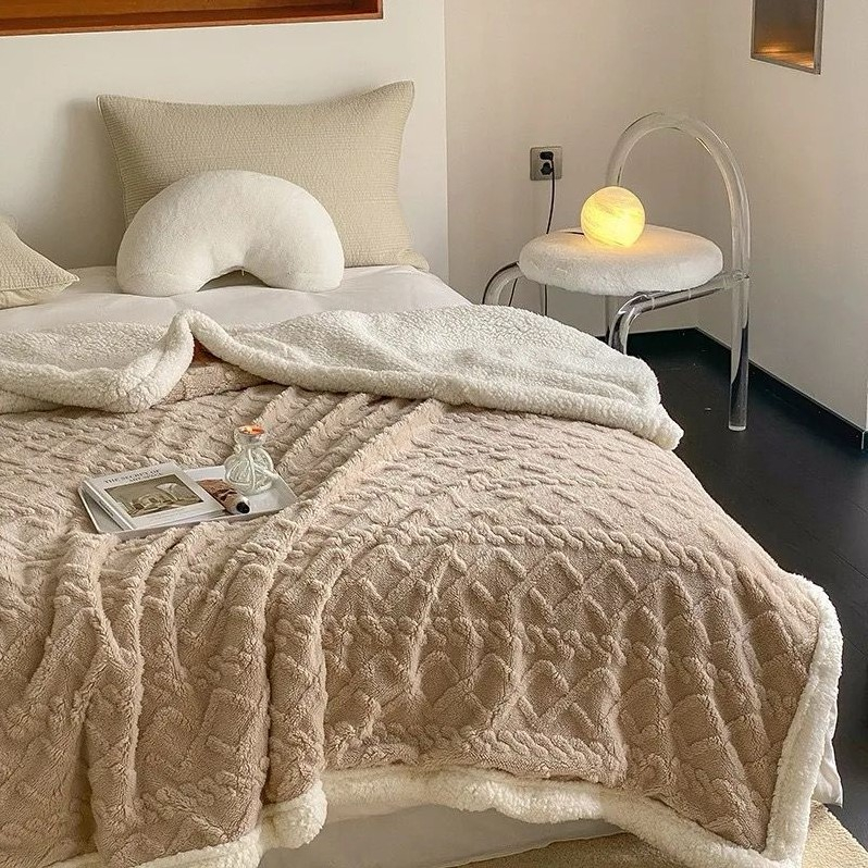 Patura Groasa Cocolino cu Blanita, bej cu model discret impletit-NR13 are textura pufoasa si catifelata,o poti folosi atat pentru decor cat si pentru a te incalzi in zilele friguroase. Ideale pentru a inlocui atat pilotele grele care incalzesc greu, dar si cearsafurile subtiri si rigide. Paturile cocolino sunt extrem de pufoase si calduroase nu sunt grele.