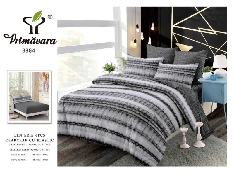 - Cearceaf de pat cu elastic: 1 bucată, pentru saltea de 180 x 200 cm. Se potrivește perfect pe saltele cu înălțimea de până la 25 cm, asigurând o fixare fermă pe tot parcursul nopții.