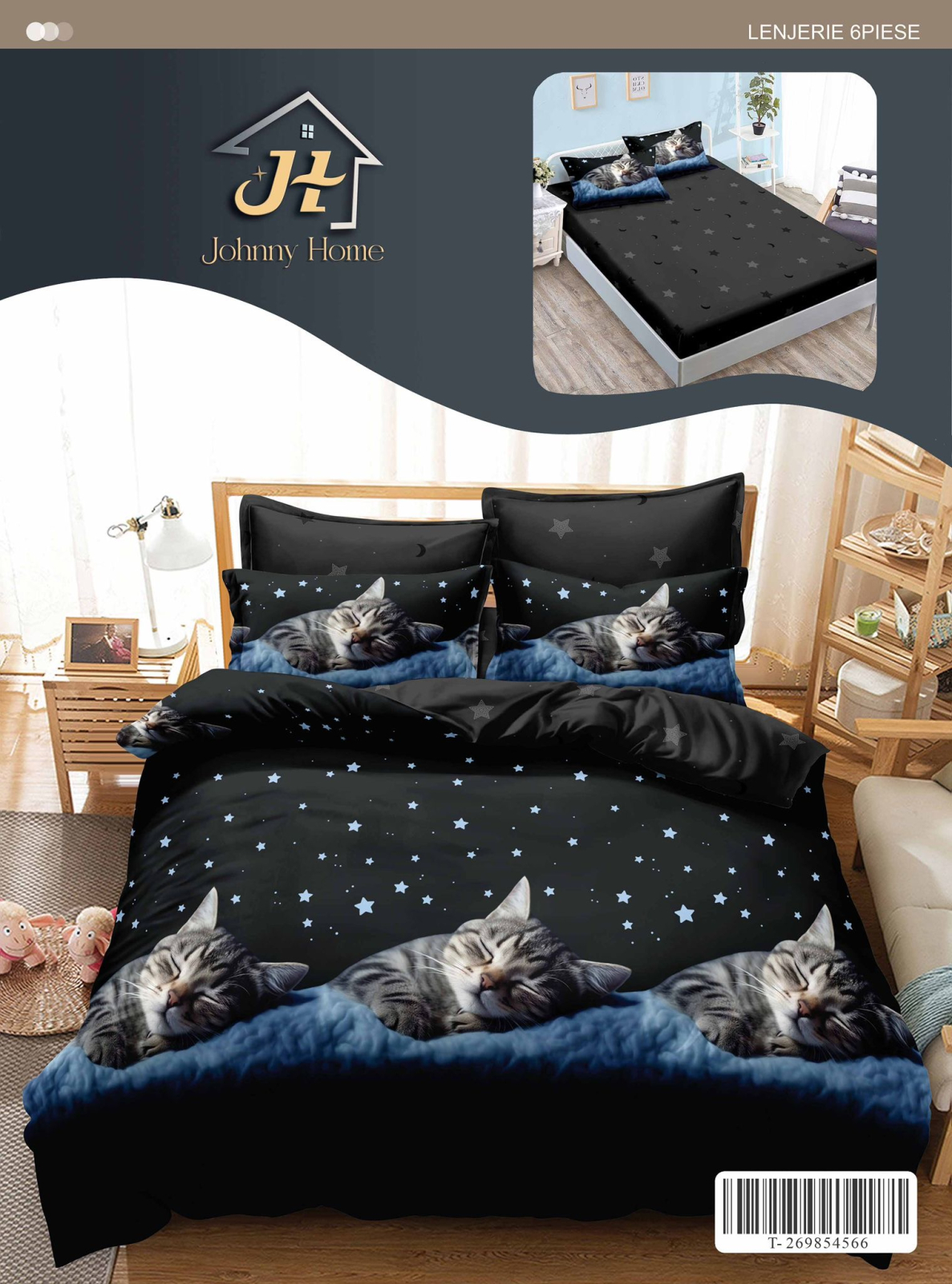 Descoperă confortul absolut cu setu Lenjerii de pat Finet 6 piese cu Elastic,imprimeu pisica si cer instelat-T323, special conceput pentru a-ți transforma dormitorul într-o oază de relaxare. Această lenjerie de pat din material finet, compusă din 6 piese practice, îți va îmbrăca patul perfect datorită cearceafului de pat cu elastic.